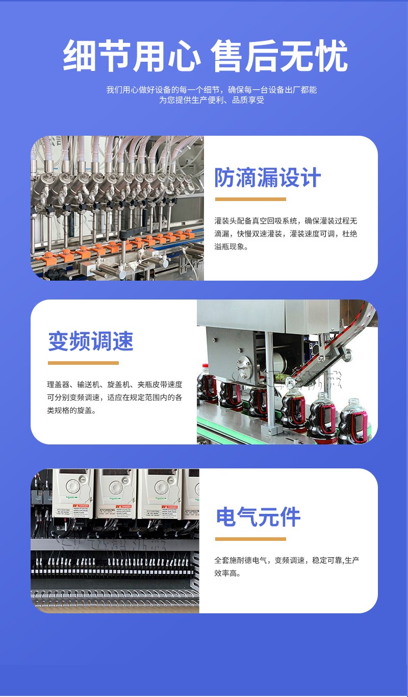 3、灌裝閥采用優(yōu)質(zhì)灌裝閥,下料速度快,灌裝量精準(zhǔn),且無滴漏現(xiàn)象產(chǎn)生。