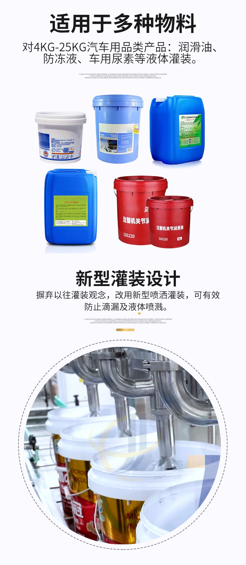 全自動(dòng)稱(chēng)重式灌裝機(jī)適用于多種物料,對(duì)4kg-25kg汽車(chē)用品類(lèi)產(chǎn)品:潤(rùn)滑油、防凍液、車(chē)用尿素等液體灌裝。