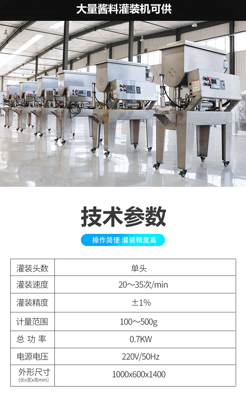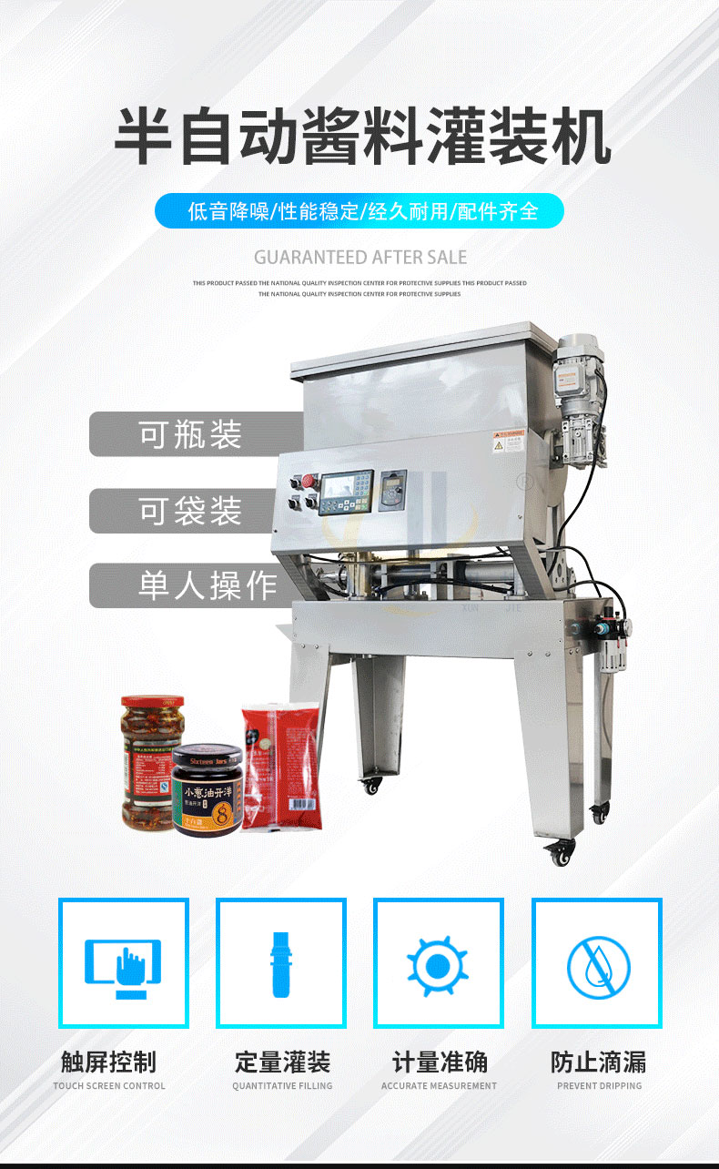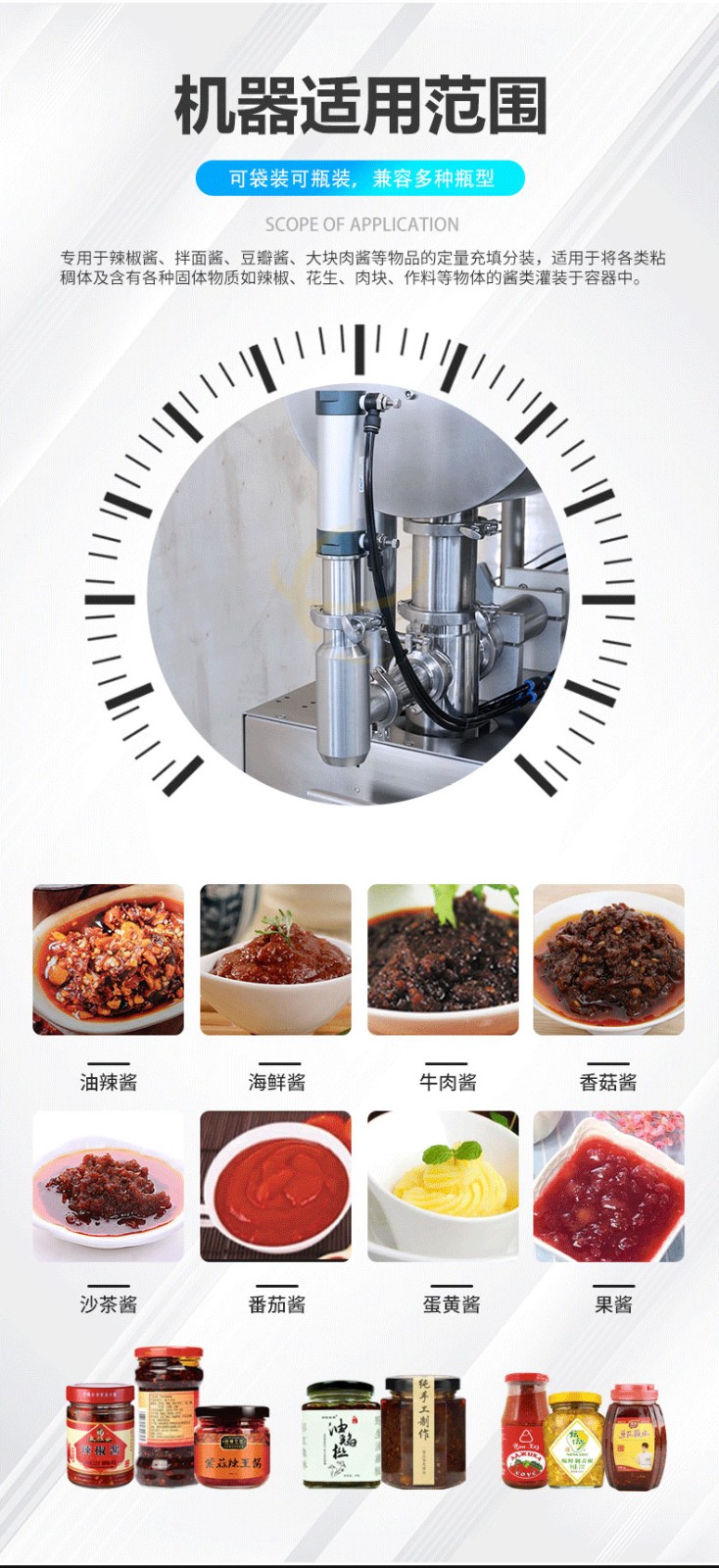 半自動醬料灌裝機(jī)適用于辣椒醬、豆瓣醬、拌面醬、大塊肉醬等物品的定量充填分裝,適用于將各類粘稠體及含有各種固體物質(zhì)