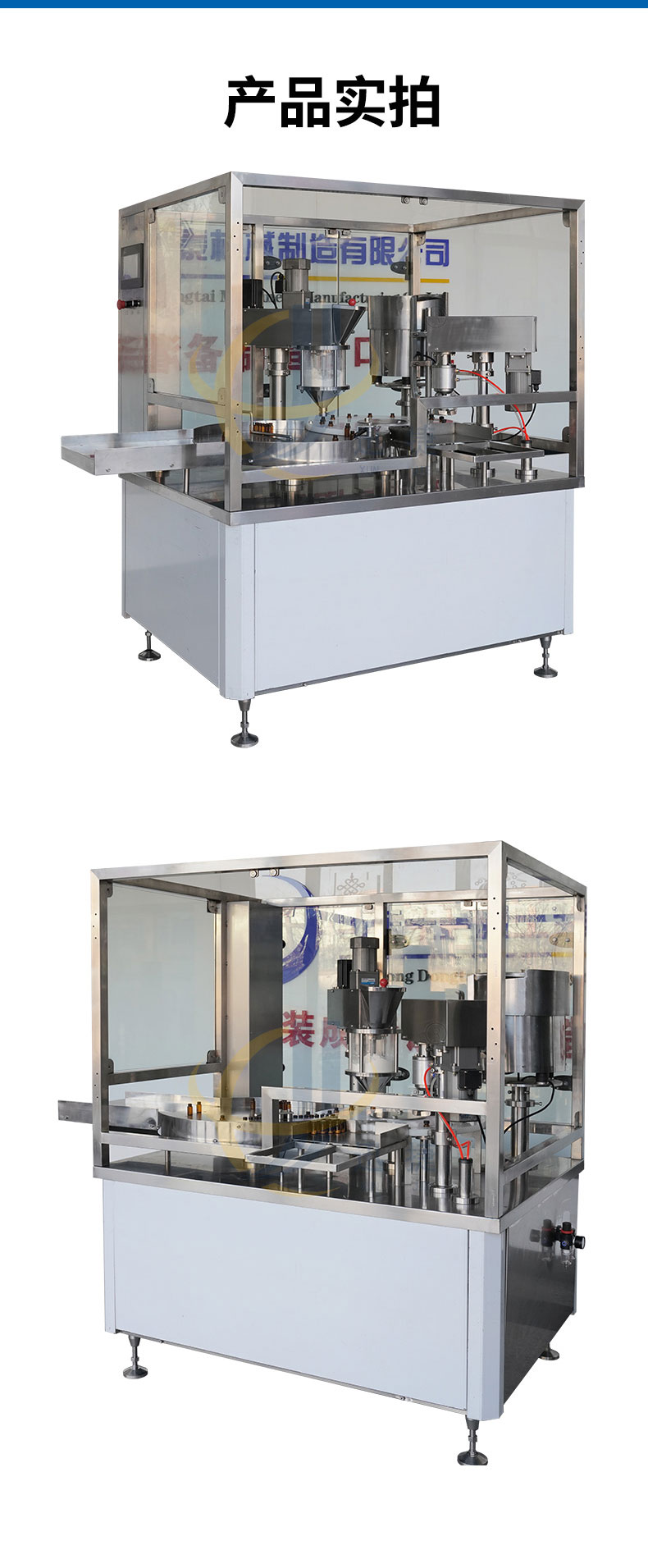 全自動粉劑灌裝旋蓋一體機適用于微量類面粉粉劑灌裝。人工進瓶,設備自動進瓶,自動定量灌裝,自動旋蓋。PLC觸屏控制。