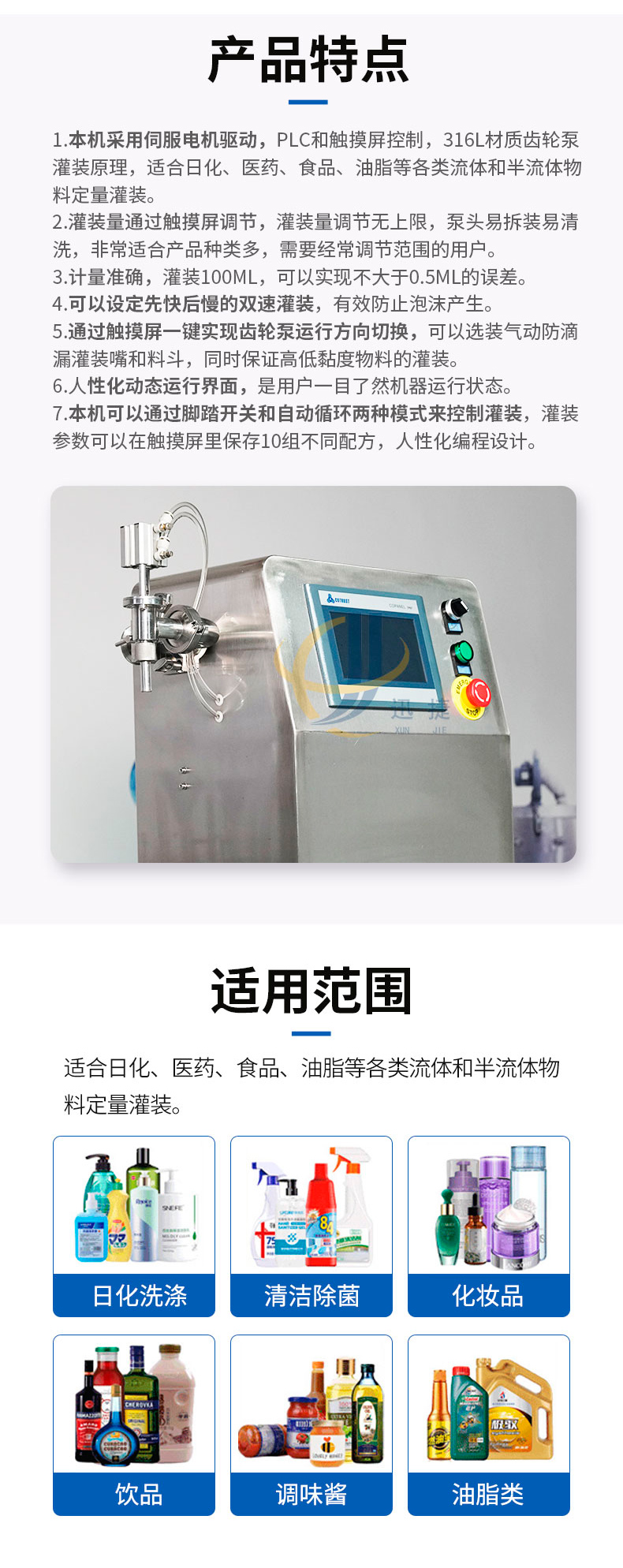 本機采用伺服電機驅(qū)動,PLC和觸摸屏控制,316L材質(zhì)齒輪泵灌裝原理,適合日化、醫(yī)藥、食品、油脂等各類流體和半流體物料定量灌裝。