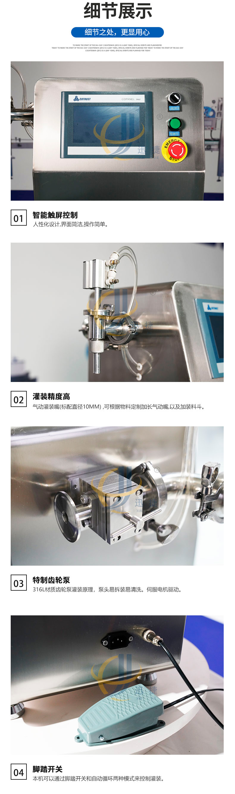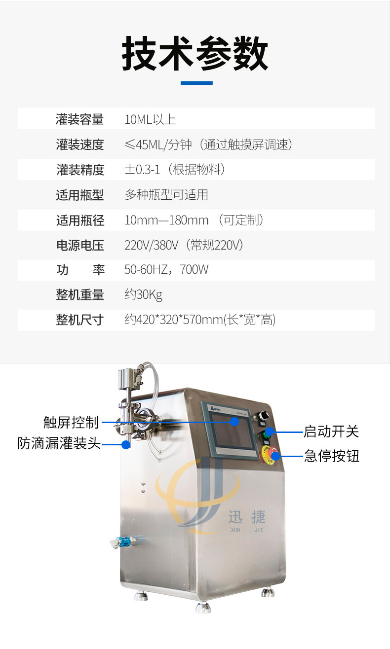 4.可以設(shè)定先快后慢的雙速灌裝,有效防止泡沫產(chǎn)生。5.通過觸摸屏一鍵實現(xiàn)齒輪泵運行方向切換,可以選裝氣動防滴漏灌裝嘴和料斗,同時保證高低黏度物料的灌裝。6.人性化動態(tài)運行界面,是用戶一目了然機器運行狀態(tài)。7.本機可以通過腳踏開關(guān)和自動循環(huán)兩種模式來控制灌裝,灌裝參數(shù)可以在觸摸屏里保存10組不同配方,人性化編程設(shè)計。